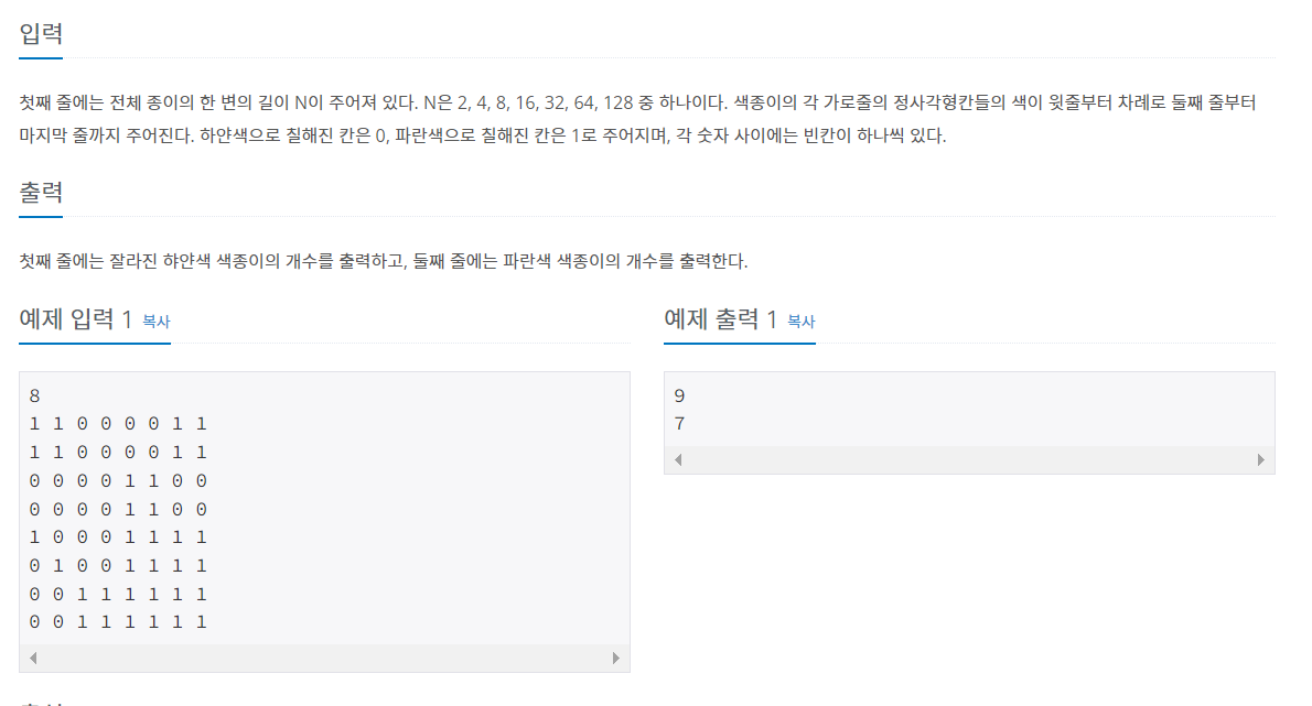 핵심은 2차원 배열속에서 2중 for문으로 영역내에서 값이 같은지 조사하고 다르면 4등분하고, 같으면 하얀색과 파란색을 count하는점이다.
